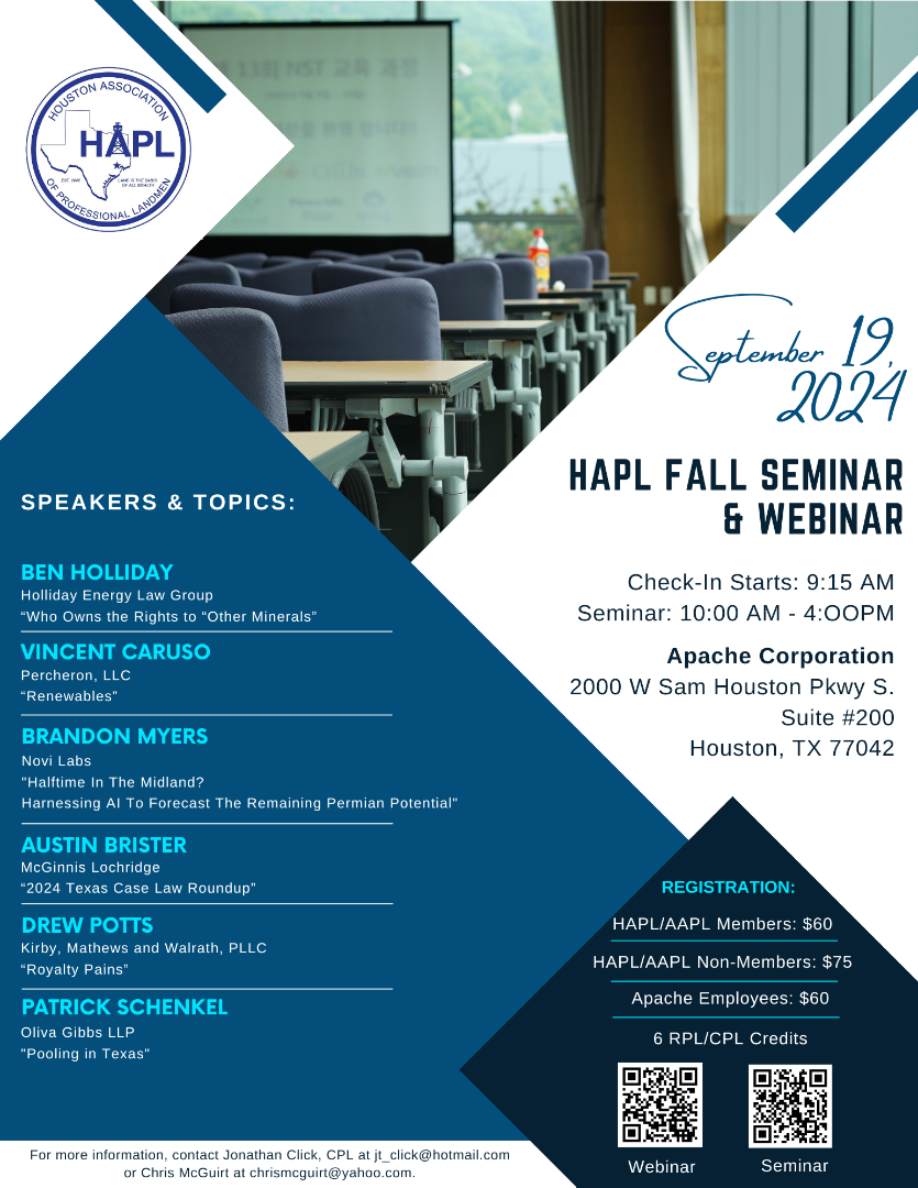 Don't forget to attend the HAPL 22nd Annual Permian Social at The Heights Social following the Fall Seminar & Webinar.