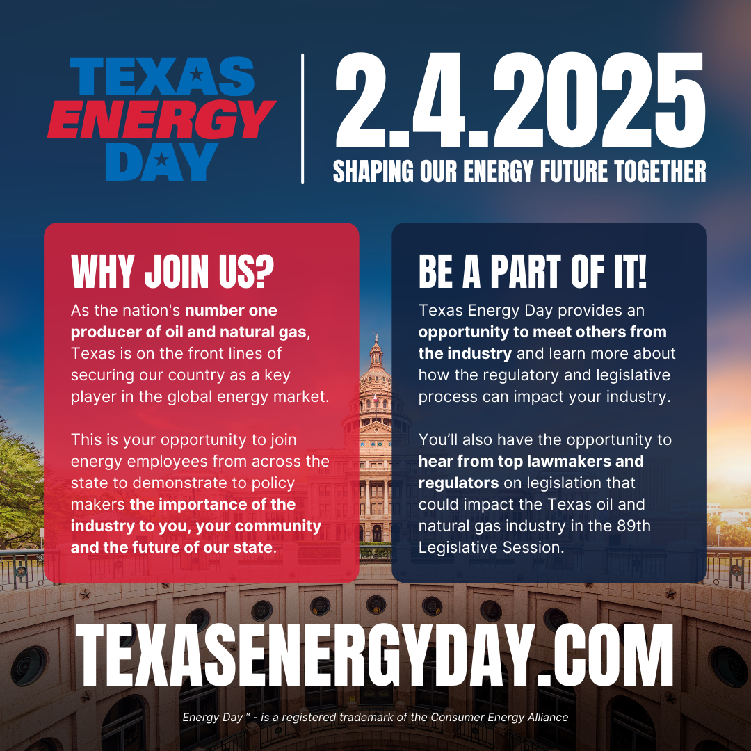 On Tuesday, February 4, 2025, you are invited to join hundreds of fellow energy supporters from across the state to participate in 2025 Texas Energy Day as they gather in Austin! We have already begun reserving space all around the Capitol for meetings, displays and lawmaker briefings, so register today!