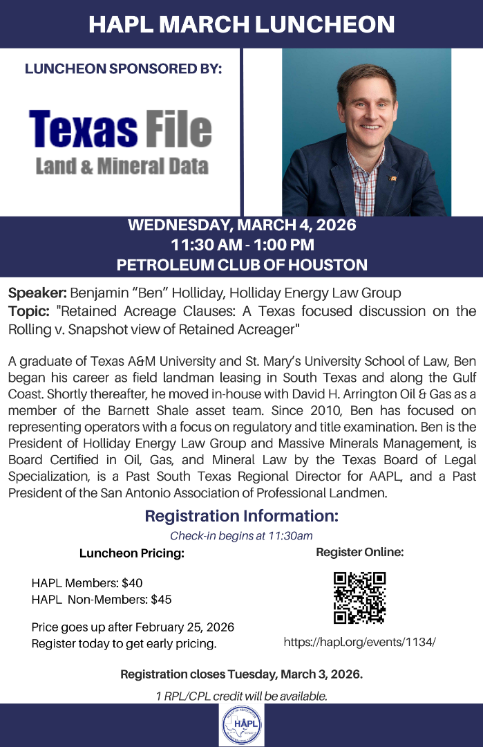 Join us for our March Luncheon at the Petroleum Club of Houston. Check-in starts at 11:30 am and lunch will be served at noon. See you there!