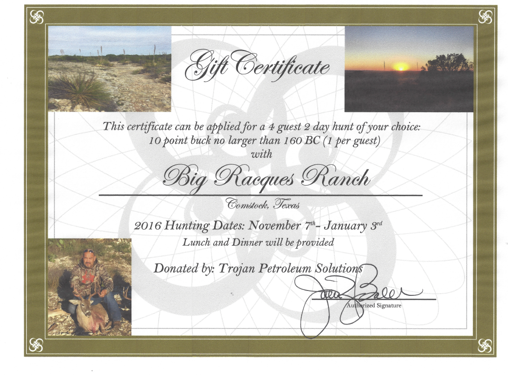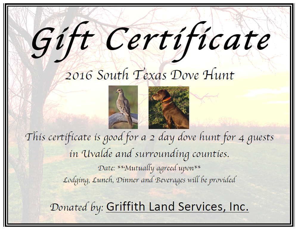 In appreciation for sponsorship, this year we will raffle off a two day deer hunt for four people and a two day dove hunt for four people. This raffle is for sponsors only! See below on how to participate. Don’t miss out on this opportunity to win one of these two hunts!