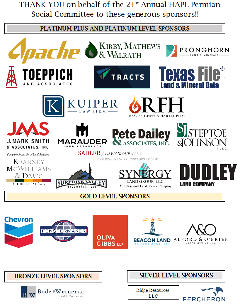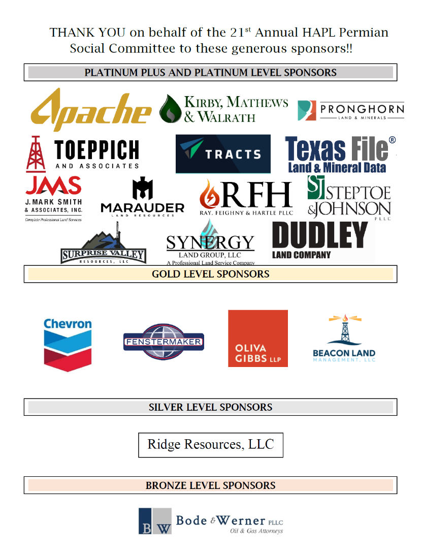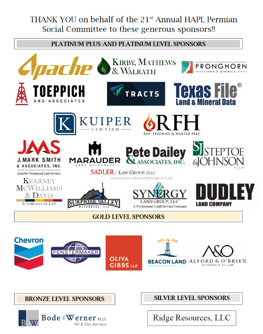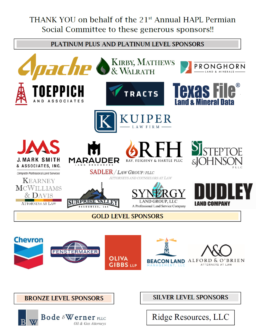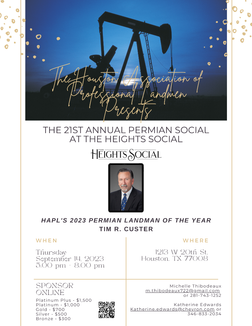 The 2023 HAPL Permian Landman of the Year Award Recipient will be honored at this year's Permian Social on Thursday, September 14, 2023, at Heights Social. The purpose of this award is to recognize an outstanding Permian Landman that has contributed to either the education/mentoring of other landmen, worked on a significant Permian divestiture/acquisition/lease play/project, or has contributed to the landman profession overall. DEADLINE TO NOMINATE IS MONDAY, AUGUST 14TH.