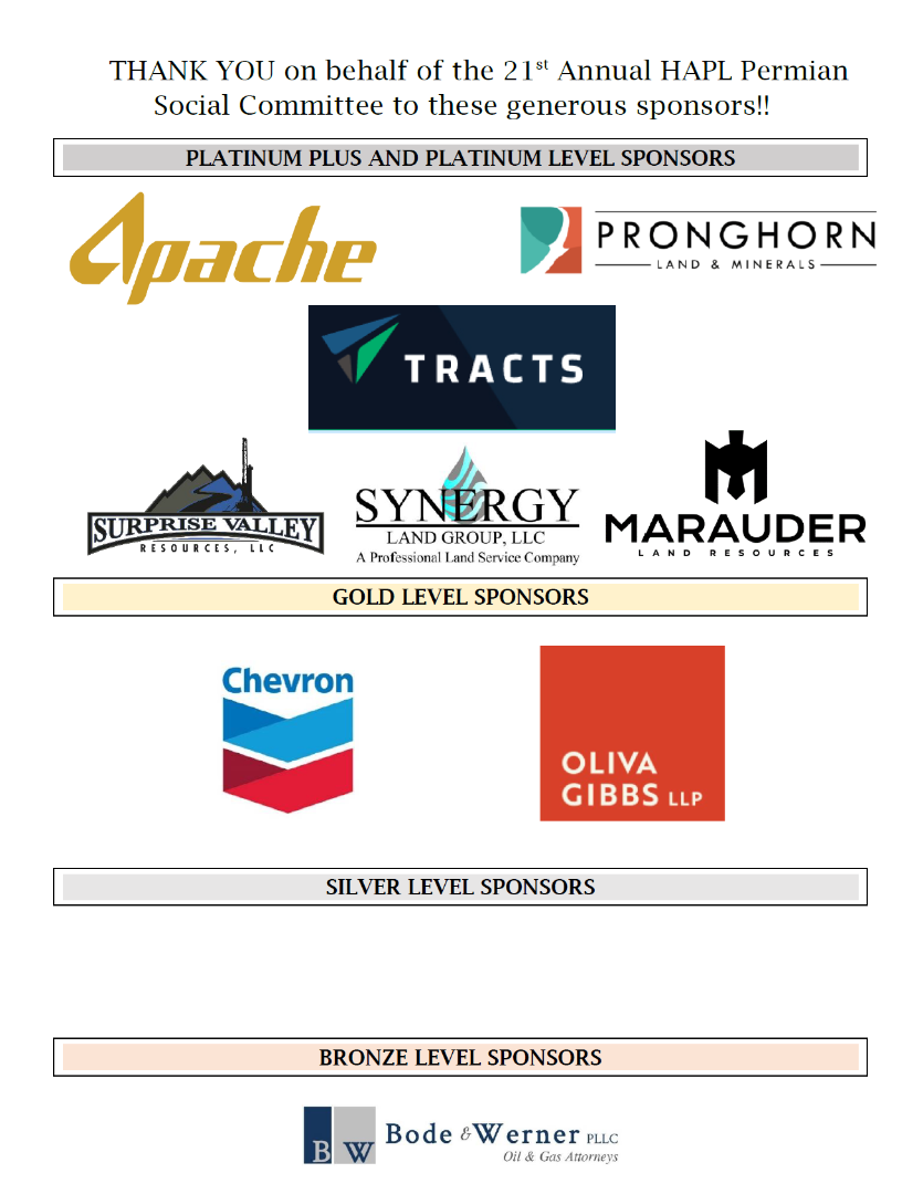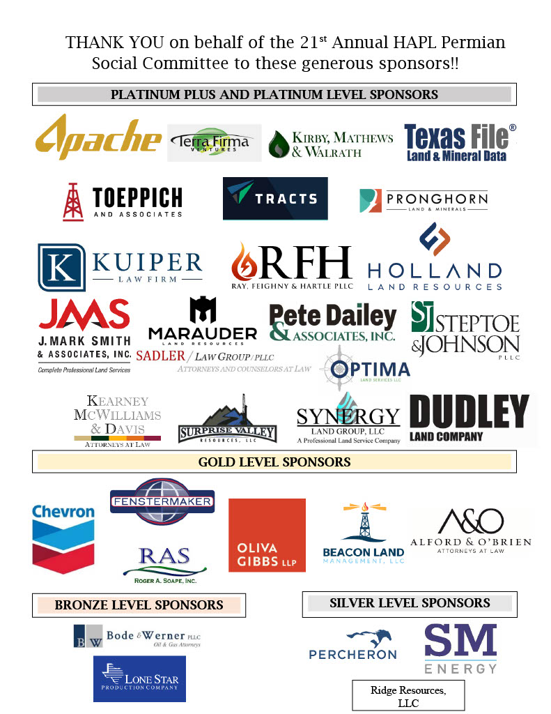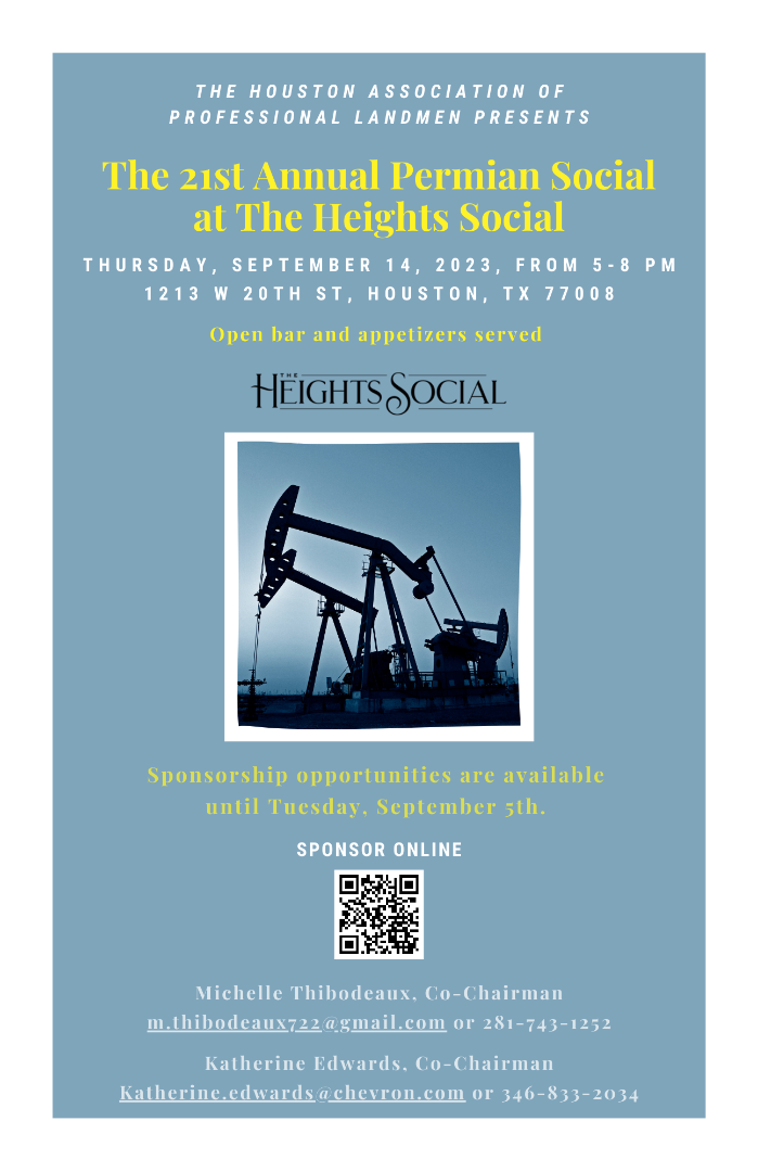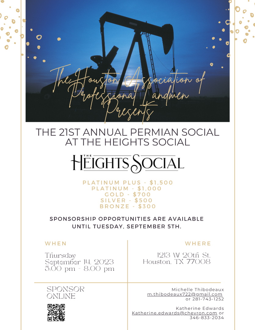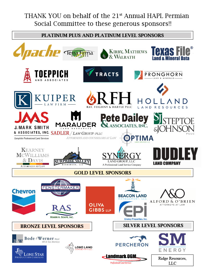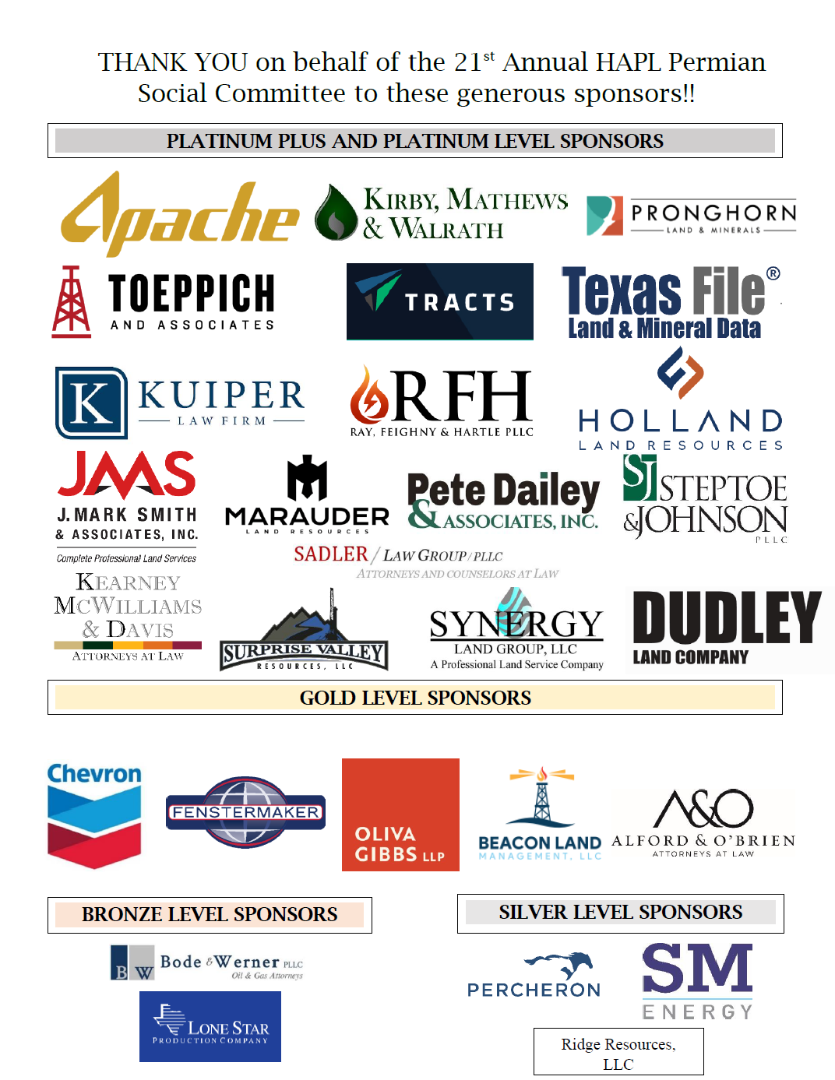 The 2023 HAPL Permian Landman of the Year Award Recipient will be honored at this year's Permian Social on Thursday, September 14, 2023, at Heights Social. The purpose of this award is to recognize an outstanding Permian Landman that has contributed to either the education/mentoring of other landmen, worked on a significant Permian divestiture/acquisition/lease play/project, or has contributed to the landman profession overall. DEADLINE TO NOMINATE IS MONDAY, AUGUST 14TH.