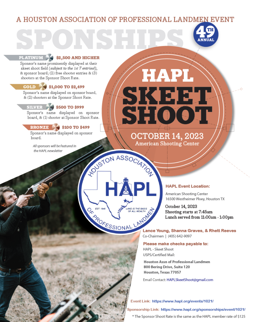 Grab your friends, family, and colleagues and register for the HAPL 49th Annual Skeet Shoot. The Skeet Shoot will be held on Saturday, October 14, 2023, at the American Shooting Centers. Entry forms must be received by October 6th. We have great sponsorship opportunities available! We will have TVs set up so you won't miss a football game while you're there, yummy food trucks lined up, drinks, and great networking! Come out and join us!