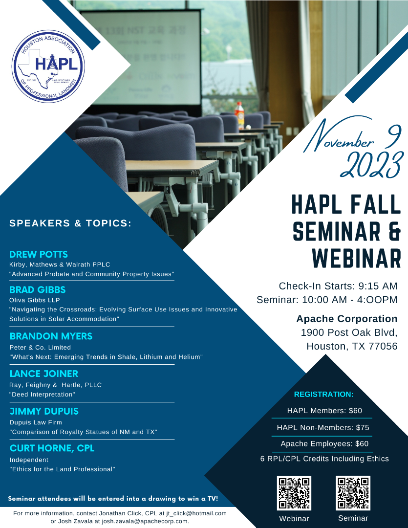 For more information, contact Jonathan Click, CPL at jt_click@hotmail.com or Josh Zavala at josh.zavala@apachecorp.com.