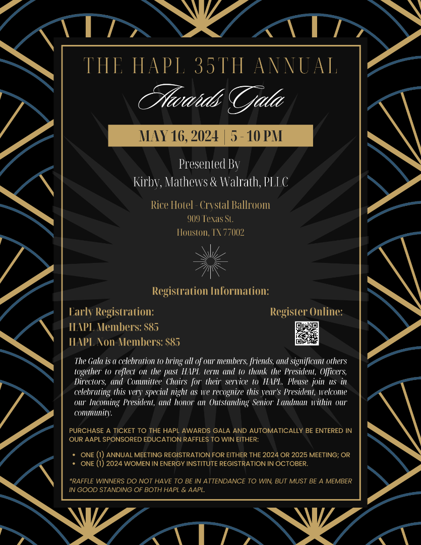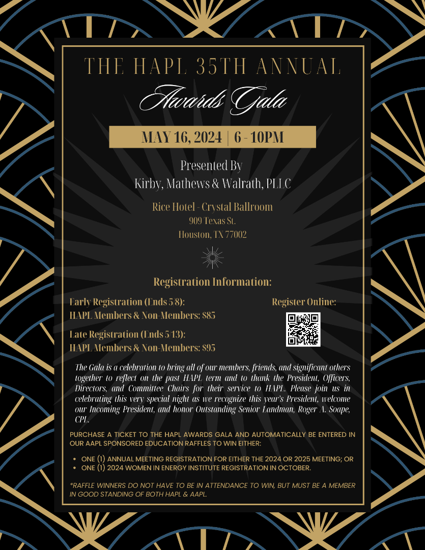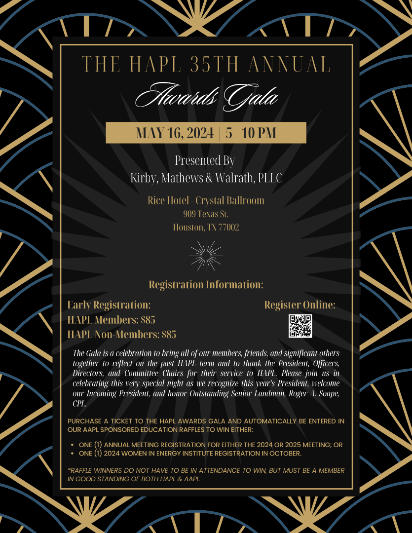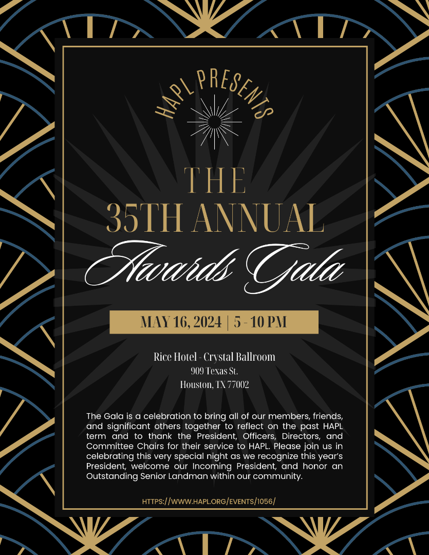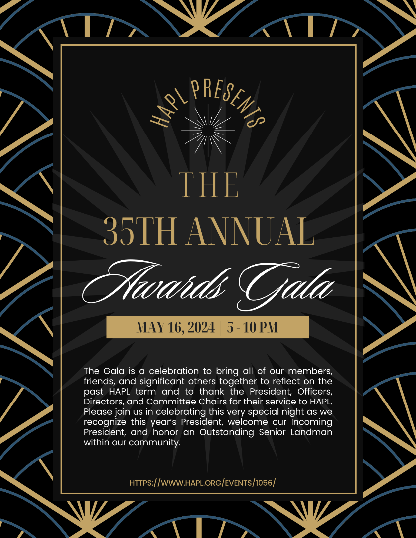 We cordially invite you to attend the 35th Annual HAPL Awards Gala, scheduled for Thursday, May 16, 2024, at the Rice Hotel's Crystal Ballroom. This event serves as an opportunity to acknowledge the efforts of our current President, Officers, Directors, and Committee Chairs for their unwavering commitment to HAPL. This gala allows us to express gratitude and our appreciation for their relentless dedication to HAPL and its members. We look forward to your presence as we commemorate the contributions of this year's President, welcome our Incoming President, and bestow honor upon our Outstanding Senior Landman, Roger A. Soape, CPL.