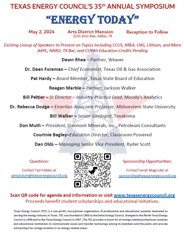 The 35th Annual Texas Energy Council Symposium will have an exciting line up of speakers and panelists, and as always, our fundraising helps support scholarship opportunities for students pursuing careers in the Oil and Gas Industry.