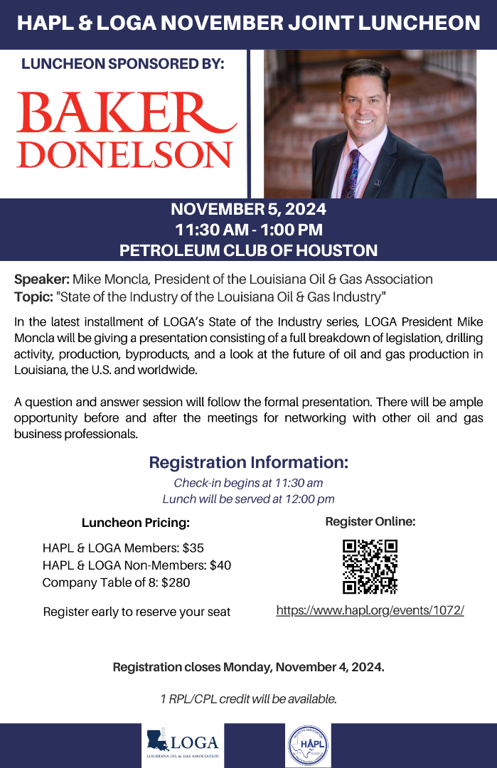 Join us for our November Joint Luncheon with LOGA at the Petroleum Club of Houston. Check-in starts at 11:30 am and lunch will be served at noon. See you there!