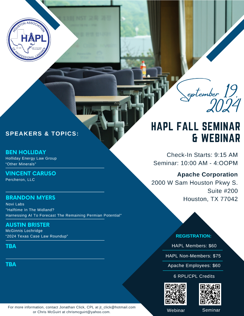 Don't forget to attend the HAPL 22nd Annual Permian Social at The Heights Social following the Fall Seminar & Webinar.