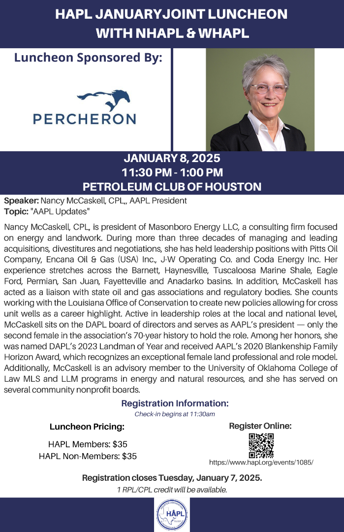 Join us for our January Joint Luncheon with NHAPL & HAPL at the Petroleum Club of Houston. Check-in starts at 11:30 am and lunch will be served at noon. See you there!