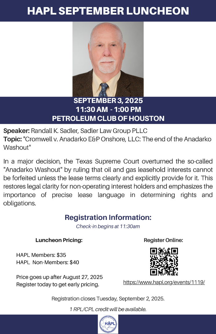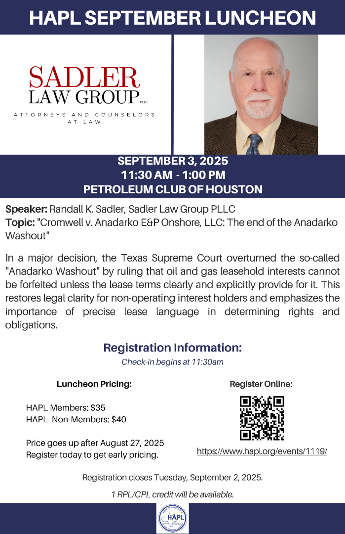 Join us for our September Luncheon at the Petroleum Club of Houston. Check-in starts at 11:30 am and lunch will be served at noon. See you there!