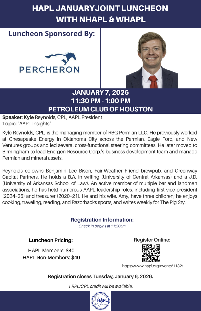 Join us for our January Joint Luncheon with NHAPL & WHAPL at the Petroleum Club of Houston. Check-in starts at 11:30 am and lunch will be served at noon. See you there!