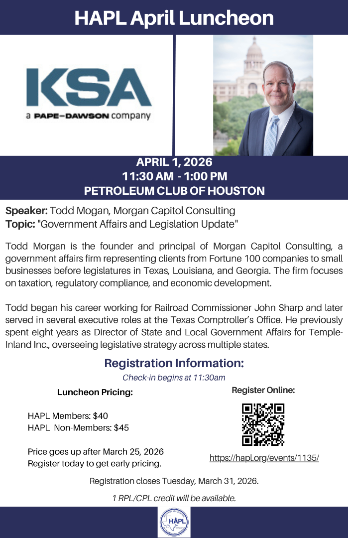 Join us for our April Luncheon at the Petroleum Club of Houston. Check-in starts at 11:30 am and lunch will be served at noon. See you there!