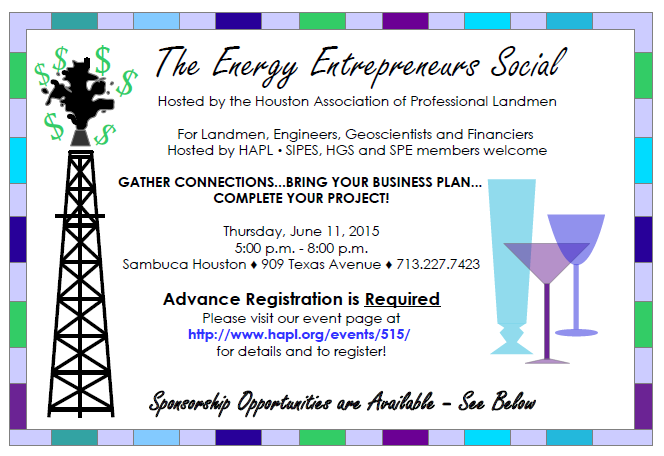 Please join us at the 2015 Energy Entrepreneurs Social, which will be held on the evening on June 11, 2015. This exciting social brings together entrepreneurial landmen, geoscientists, engineers and financiers into a networking opportunity specifically focused on the formation of new management teams for E & P Company startups. The purpose of this event is to unite new and prospective entrepreneurs who are looking to strike out on their own or are actively assembling management teams.