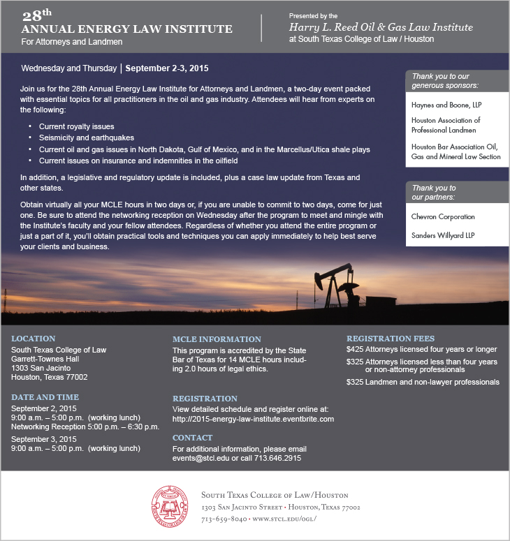 Accredited by the State Bars of Texas and Oklahoma, the Supreme Court of Louisiana, and by the American Association of Professional Landmen for 14.0 total credit hours (2.0 ethics).
