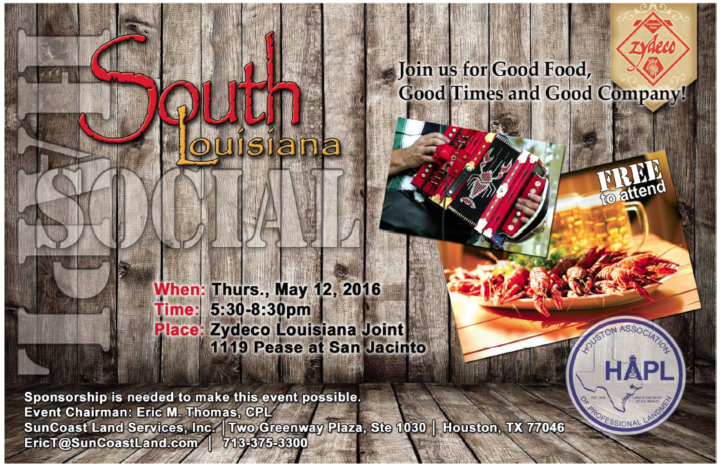 The annual H.A.P.L. South Louisiana Social has been scheduled for May 12, 2016 at Zydeco Louisiana Joint, 1119 Pease at San Jacinto (downtown Houston). As committee chairman, I respectfully request your financial support of the 2016 H.A.P.L South Louisiana Social.