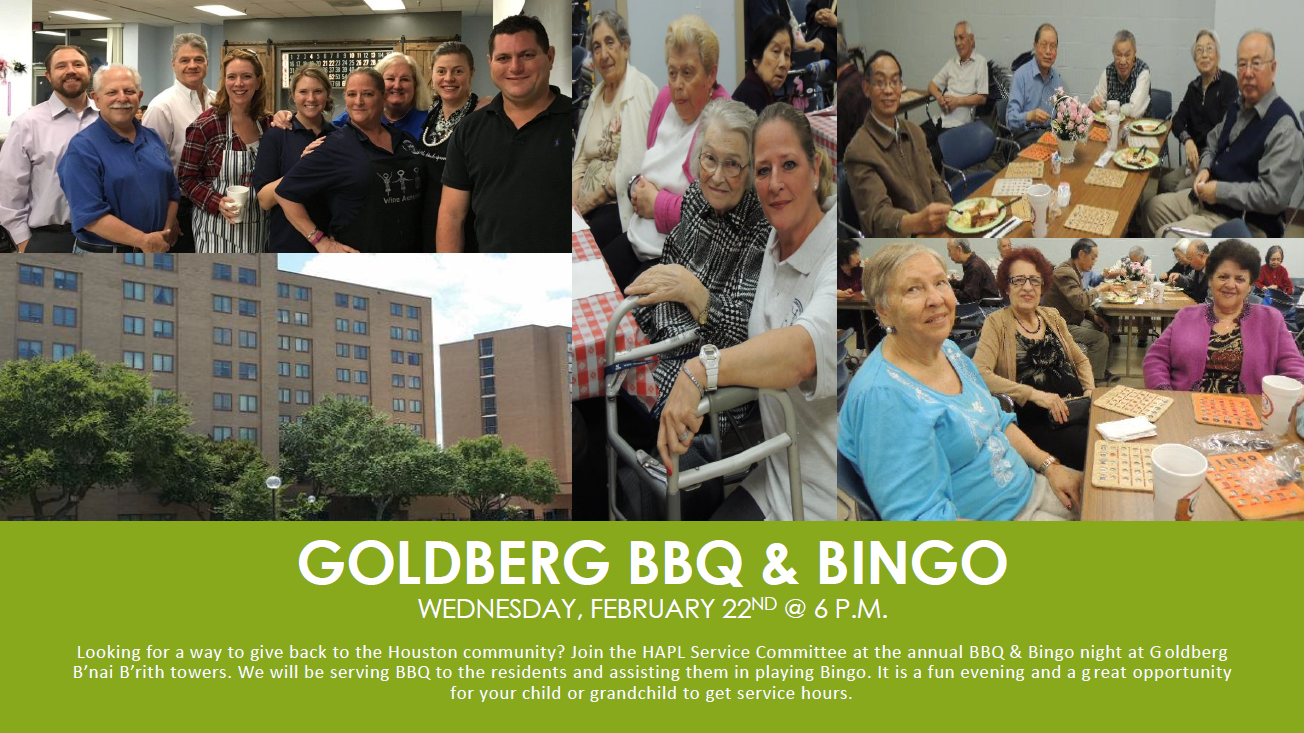 Once a year the Service Committee of HAPL goes to the Goldberg B’nai B’rith Towers and caterer’s a BBQ dinner to about 125 residents of the lower income Senior Citizens Housing complex. HAPL is the only organization all year that provides a free hot meal to this community. During dinner, we need volunteers to serve the BBQ and others to help less mobile residents get their plate and beverage to the table. After dinner we play bingo for Wal-Mart gift cards as the prizes. The residences of Goldberg are always so very appreciative of the dinner and time we spend with them; any HAPL member who participates walks away feeling like they really did make a positive difference in someone else’s life that day.