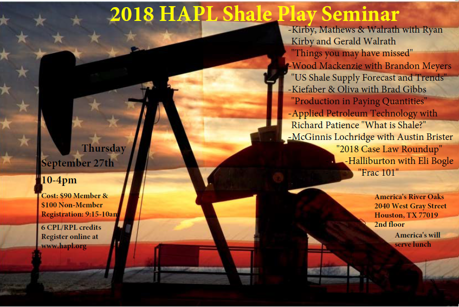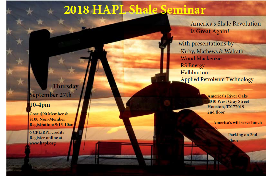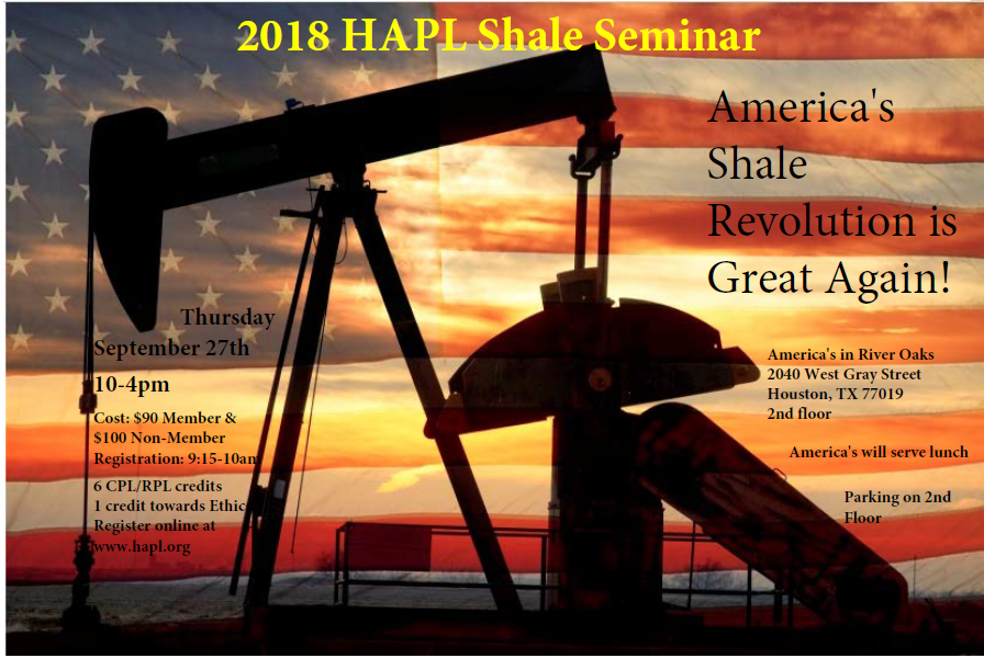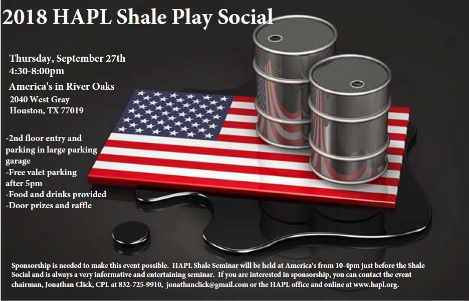 The Houston Association of Professional Landmen (HAPL) Shale Play Seminar and the Shale Play Social will be held Thursday, September 27, 2018 at America's River Oaks, 2040 Houston, Texas, 77019. The social is an informal networking event in Houston dedicated to those individuals and companies that work in or have an interest in shale plays. The HAPL Shale Play Social proved to be a very successful networking event for shale players last year - there were over one hundred landmen in attendance! This event is only made possible by our generous sponsors. Our goal is to make this year’s HAPL Shale Play Social an even greater networking success. The social will also be held at America's after the seminar.