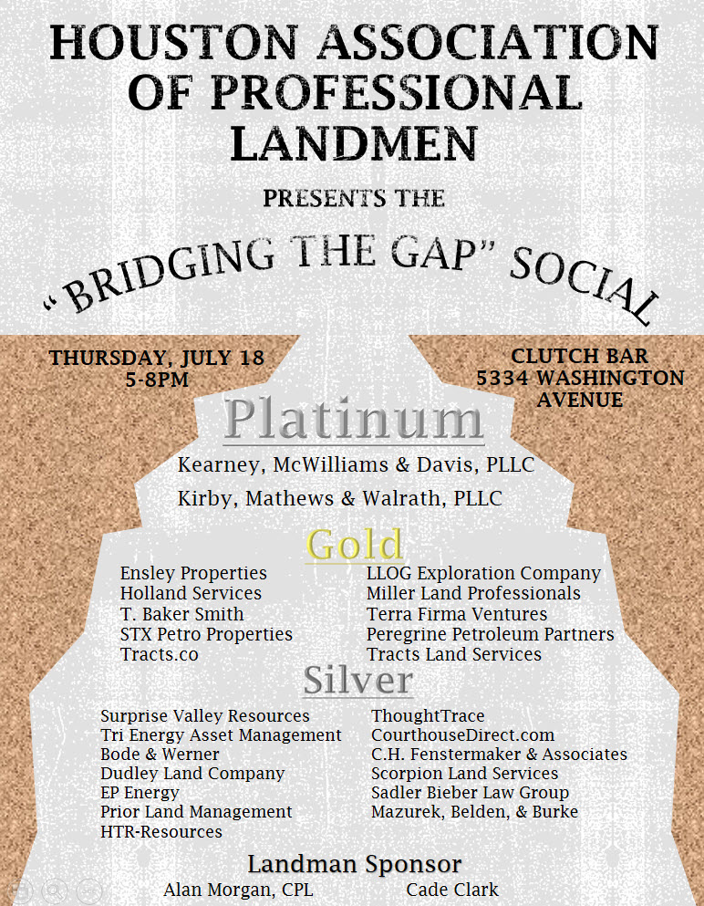 The “Bridging the Gap” idea highlights the inclusive nature of the event, inviting Landmen of all ages, experience, and backgrounds to come together for networking and good times. Summer interns and potential new HAPL members are invited as well. We expect this year’s social to be the largest of its kind and sponsoring this event will give your company a bright opportunity to demonstrate its commitment and gain visibility to a wide audience.