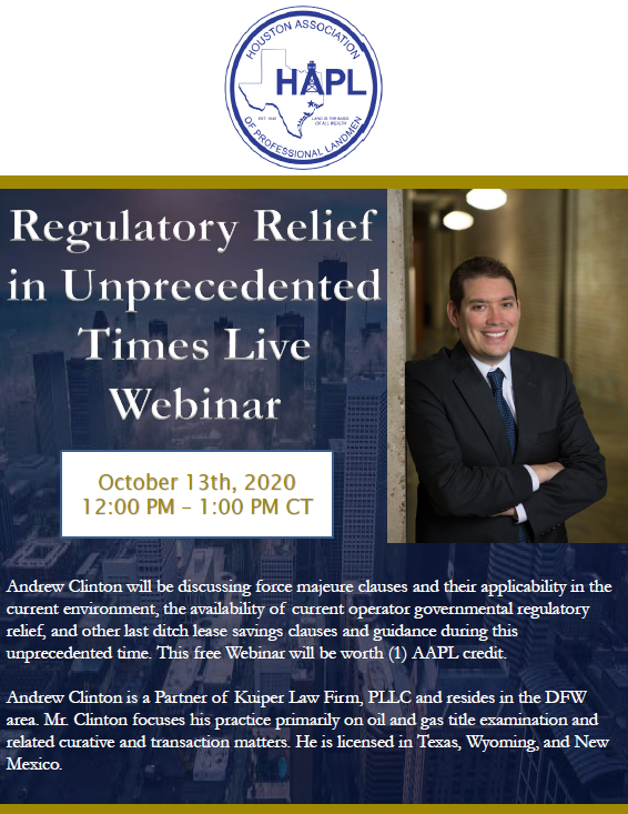 The HAPL October Webinar will be held on Tuesday, October 13, 2020 via online webinar from 12:00pm – 1:00pm. The topic will be "Regulatory Relief in Unprecedented Times" by Andrew Clinton, Partner at Kuiper Law Firm. This luncheon will be certified for 1 CPL/RPL credit.