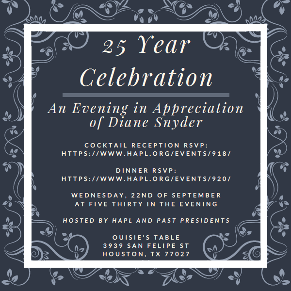Join HAPL for a special evening as we invite friends, family, and colleagues to come together to honor and appreciate Diane Snyder for her 25 years of hard work and dedication to HAPL.