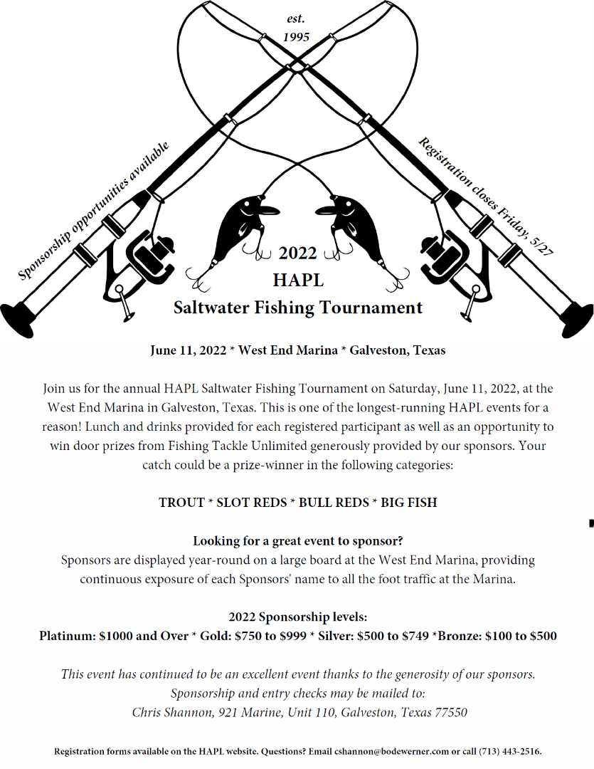 - All contestants assume any and all risks to their safety throughout the tournament. This Tournament benefits the HAPL to help support the HAPL. Consequently, NO REFUNDS, unless Tournament is cancelled. In the event of refund due to cancellation, a refund fee of no more than 6% may be assessed. Should a hurricane occur, the tournament date will be moved.