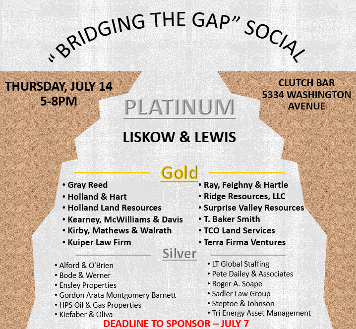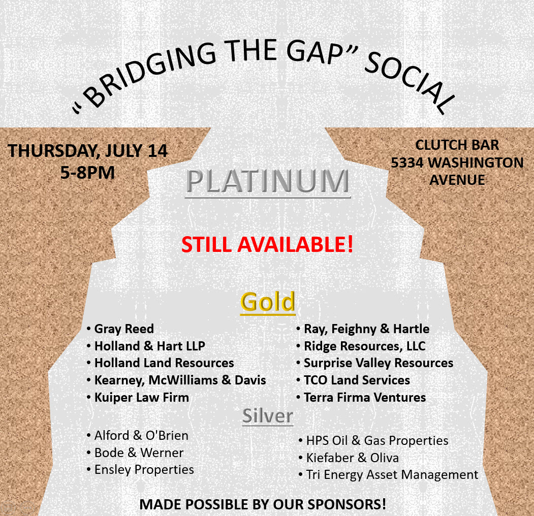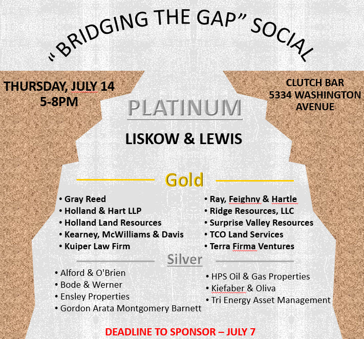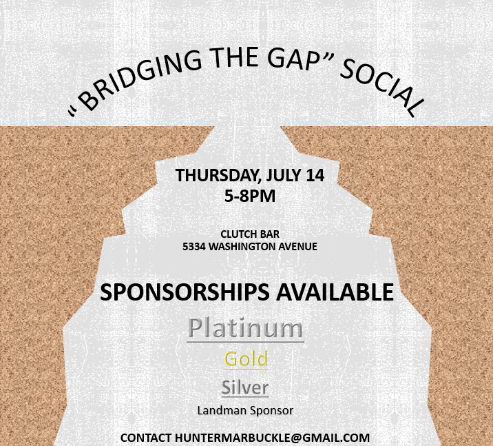 The “Bridging the Gap” idea highlights the inclusive nature of the event, inviting Landmen of all ages, experiences, and backgrounds to come together for networking and good times. Summer interns and potential new HAPL members are invited as well. We expect this year’s social to be the largest of its kind and sponsoring this event will give your company a bright opportunity to demonstrate its commitment and gain visibility to a wide audience.