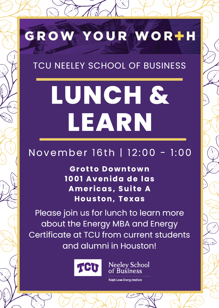 Event Description: Please join us for lunch and learn more about the Energy MBA and Energy Certificate at TCU from current students and alumni in Houston.
